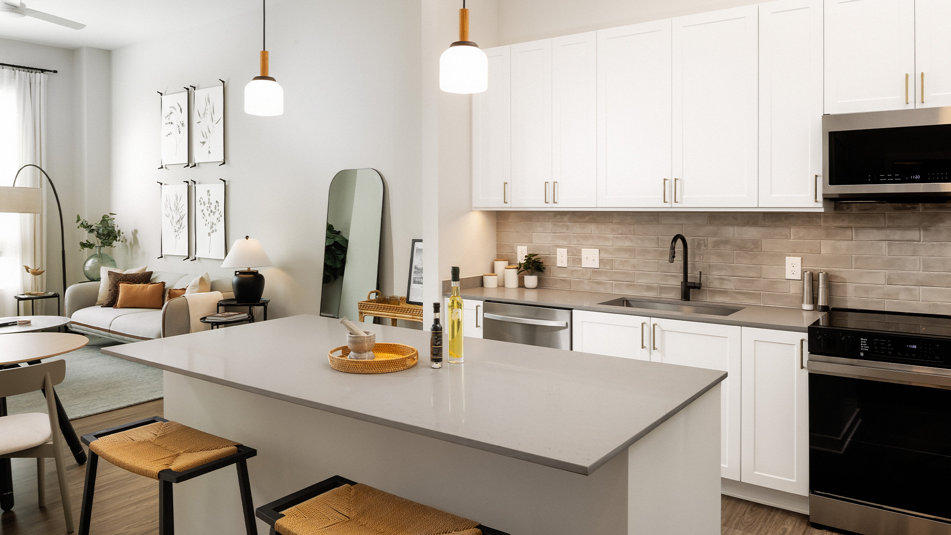 Modern kitchens with stainless steel appliances, quartz countertops, tile backsplashes, and hard-surface flooring